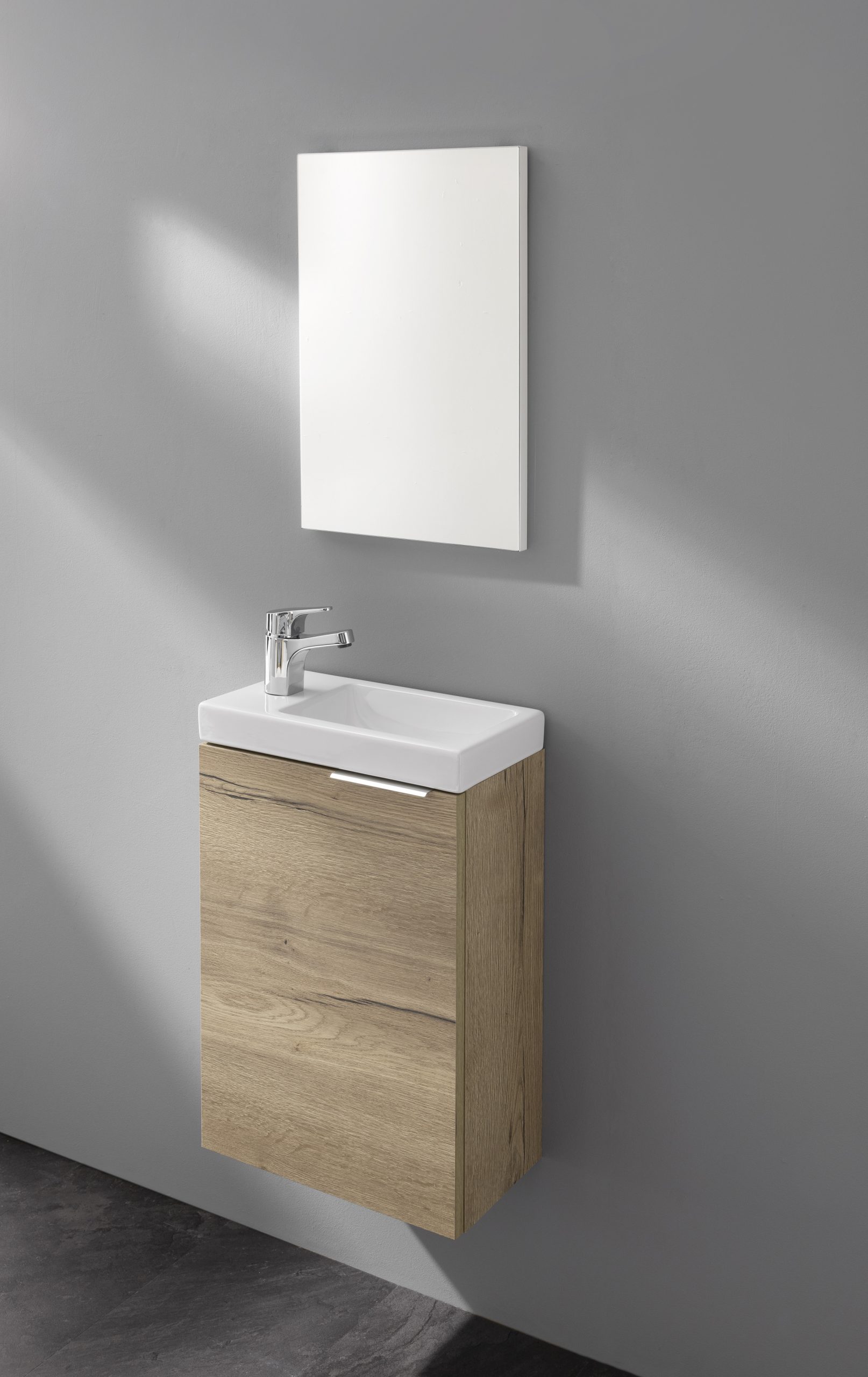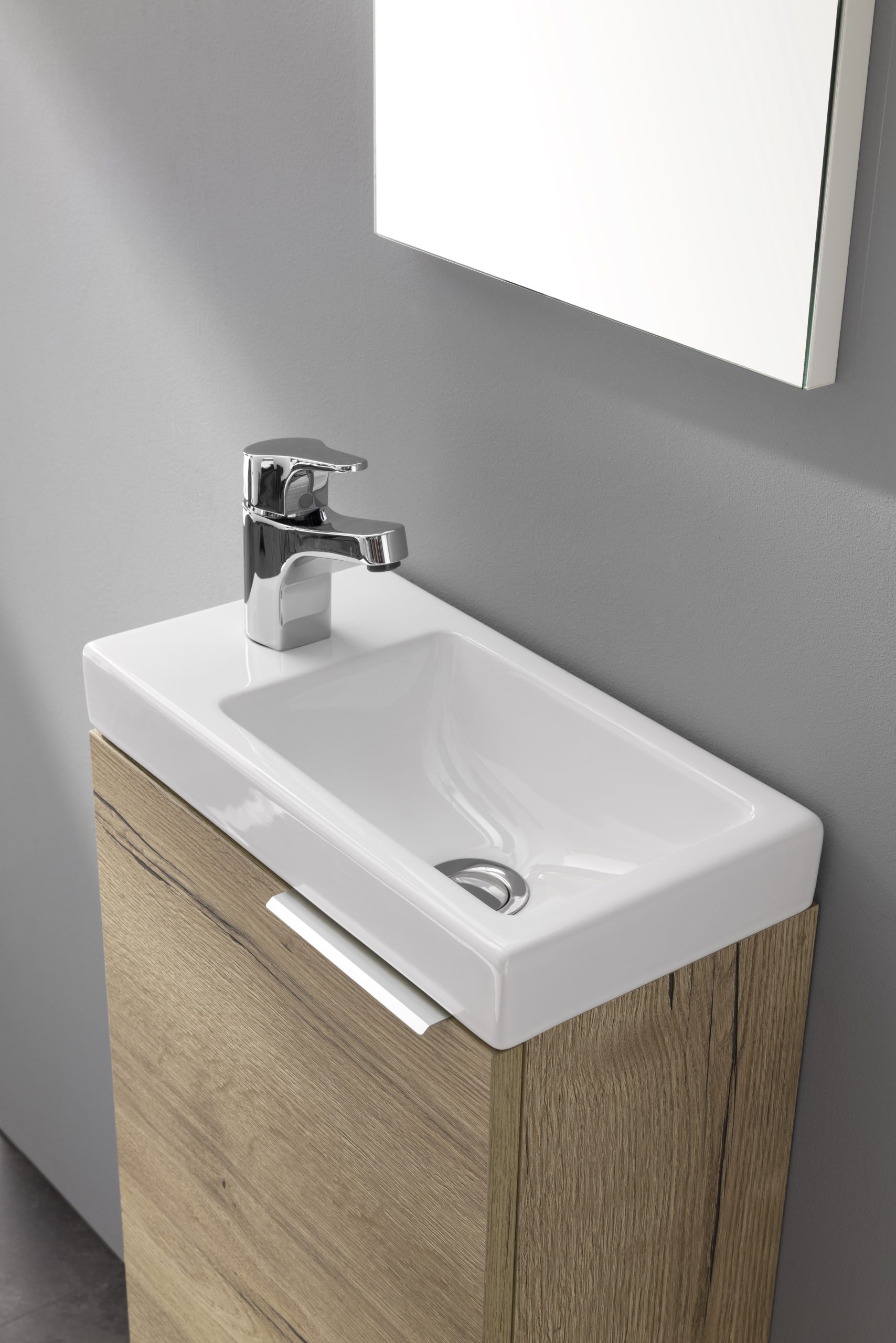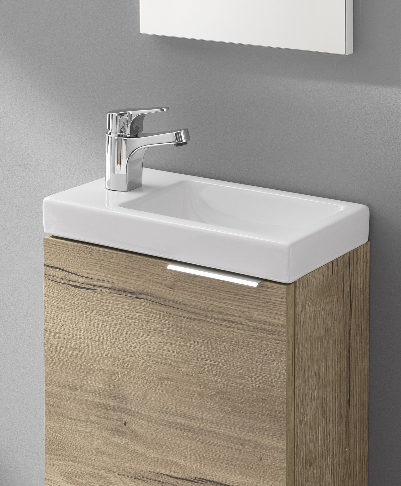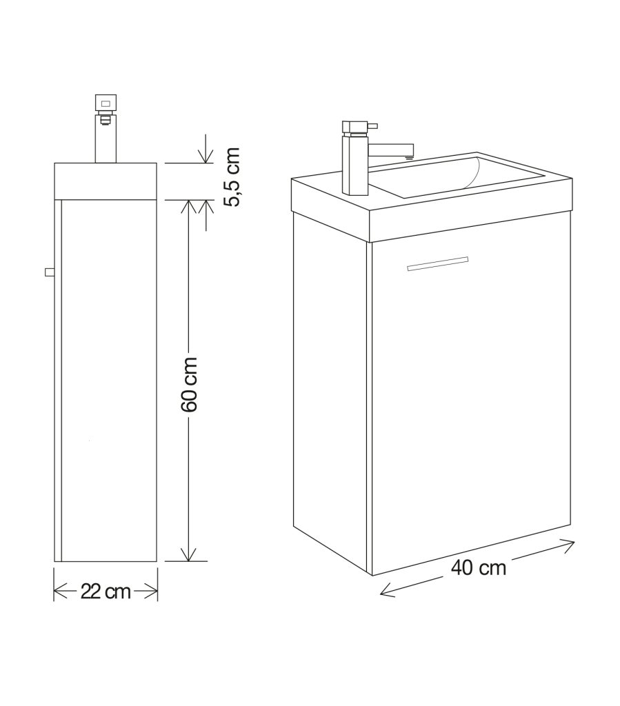 Lave-mains 1 porte L 40 cm – H 60 cm – Prof 22 cm : • Meuble livré monté – étagère intérieure • Vide sanitaire – profondeur 7 cm • Porte réversible à l’installation • Installation possible en angle • Fermeture silencieuse avec charnières amorties